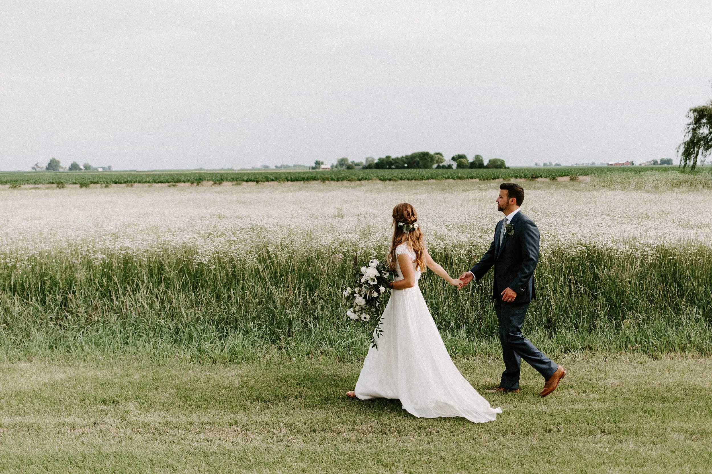 I met Lauren and Michael up at the sleeping bear dunes for their engagement session and I knew from then I was going to love their wedding day! They are so kind and laid back, and easy to talk to! Plus their little pup, Bo, is just the cutest! Lauren has the best style and everything turn out gorgeous! Their reception venue, Ashley barn was seriously one of my favorites of the year. It was a charming white barn with a large patio area including strung lights, an outdoor bar, yard games, and there were even pretty fields and a willow tree for portraits! Plus, I am just a sucker for a white barn which paired well with her chic BHLD bridal look!